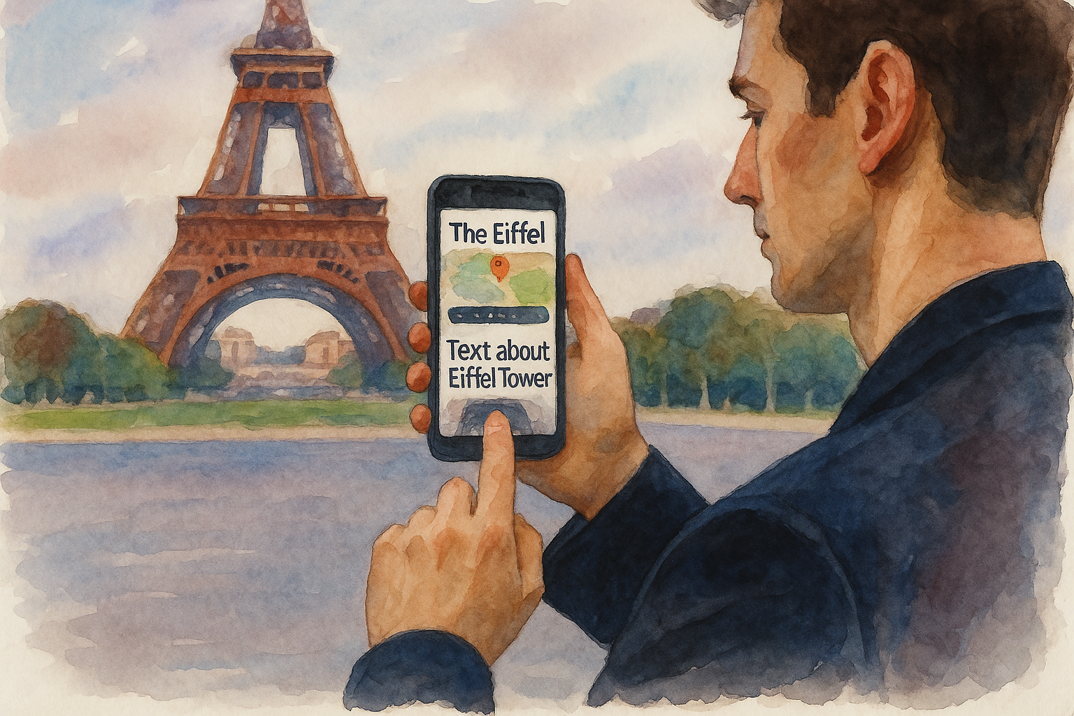Illustrated guide with tips for visiting Paris, including visiting a café, using the metro, reading a guide, and finding hidden gems on a smartphone.
